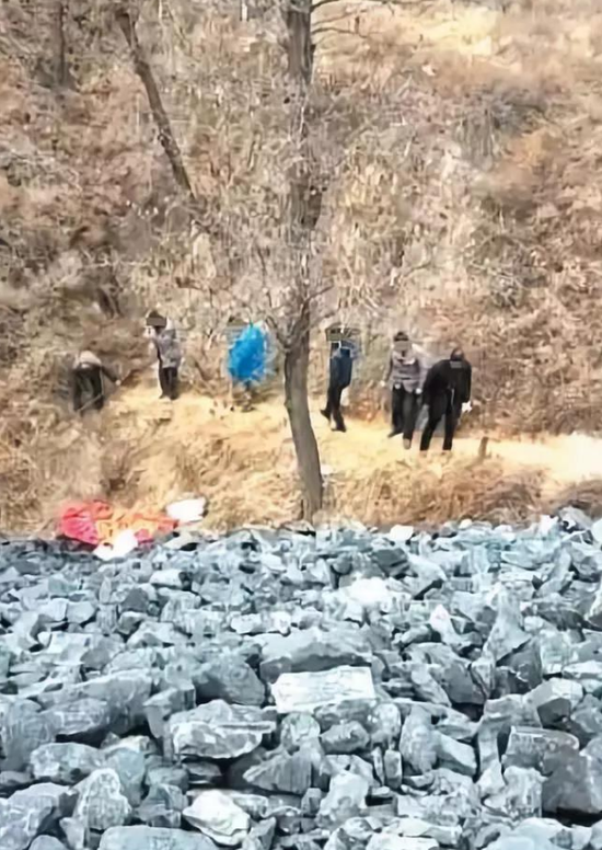 路修通了,杜安打開手機錄了段視頻。畫面里,灰白的矸石坡下,排在最前的老漢還在彎腰鏟草,他離尸體僅有一步距離。6人著裝普通,沒有人佩戴口罩。