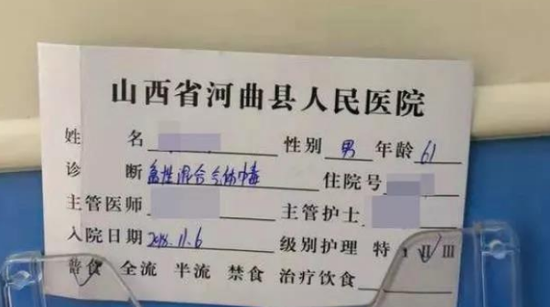 周青峰(化名)在河曲縣人民醫(yī)院就診,就診卡顯示其為急性混合氣體中毒。